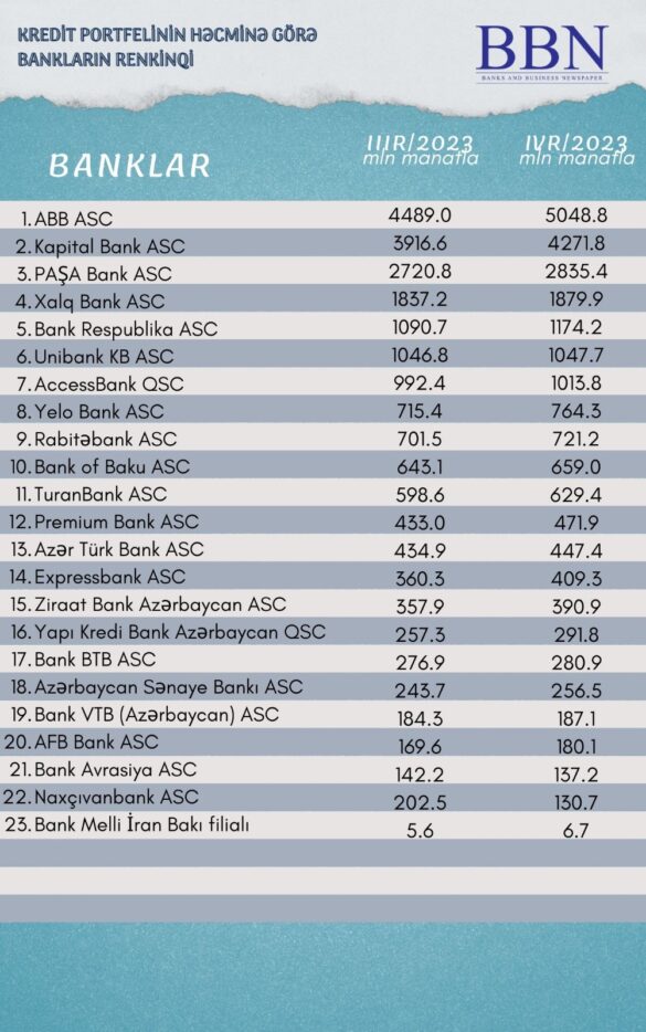 Banklar və Biznes nəşri BBN.az maliyyə göstəricilərini Azərbaycan Banklar Assosiasiyasına (ABA) təqdim etmiş bankların kredit portfelinin həcminə görə renkinqini təqdim edir.