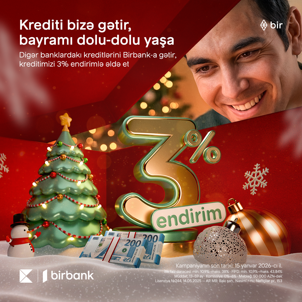 Sərfəli kredit axtarışında olanlar, Birbank-ın digər banklarda kredit öhdəliyi olan müştərilər üçün əsl bayram hədiyyəsi edir. Belə ki, indi digər banklardakı kreditlərini Birbank-a gətirən hər kəs təyin olunan kredit faizinə 3% endirim qazanır. Artıq minlərlə insan bu fürsəti dəyərləndirib. Siz də Yeni ili çətin maliyyə hesabatları aparmadan, büdcə sıxıntısı çəkmədən dolu-dolu yaşamaq istəyirsinizsə bu şansı qaçırmayın.