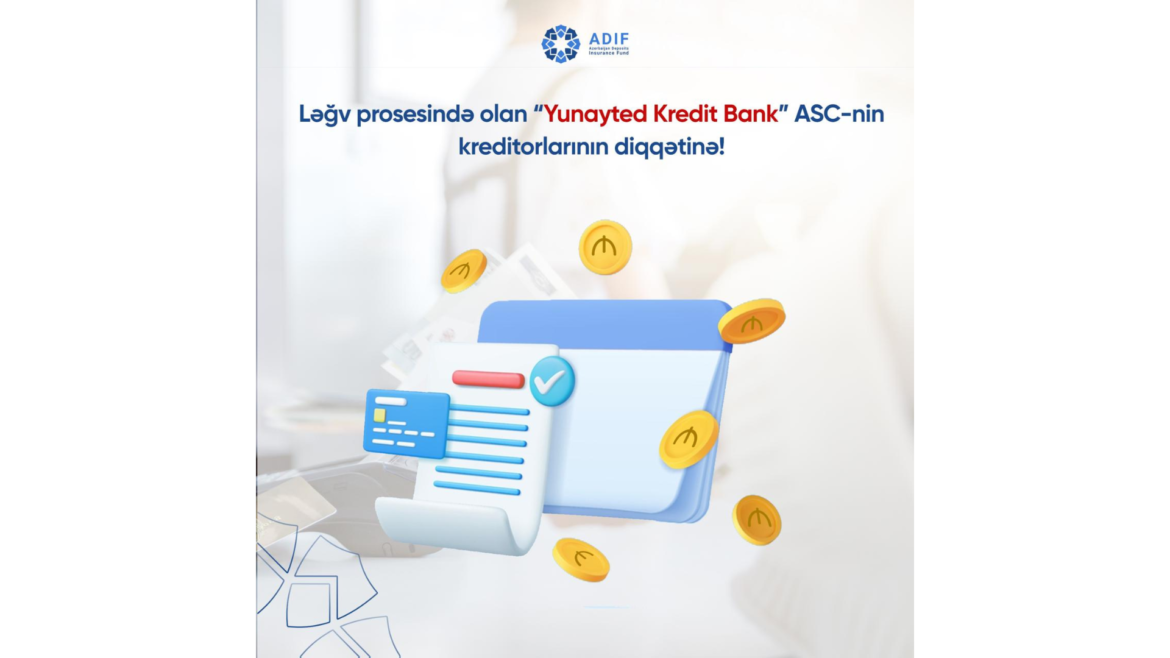 Əmanətlərin Sığortalanması Fondu ləğv prosesində olan “Yunayted Kredit Bank” ASC-nin kreditorlarının diqqətinə çatdırır ki, “Banklar haqqında” Azərbaycan Respublikası Qanununun 82.1.5-ci maddəsinə əsasən bankın müflis elan olunmasına dair məhkəmə qərarının qəbul edildiyi tarixdən əvvəlki altı aydan çox olmayan dövr üçün ödənilməli müavinətlərin, əmək haqlarının verilməsi haqqında bankın işçilərinin və keçmiş işçilərinin, habelə Qanunun 82.1.8-ci maddəsinə əsasən təminatsız kreditorların tələbləri üzrə ödənişlərə 18 noyabr 2024-cü il tarixdən etibarən başlanacaqdır.