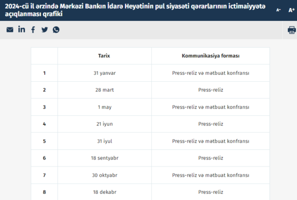 Qeyd olunan tarixlərdən 31 yanvar, 1 may, 31 iyul və 30 oktyabr tarixlərində qərarın açıqlanması mətbuat konfransı ilə müşayiət olunacaqdır.