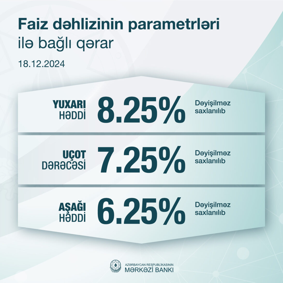 Azərbaycan Respublikası Mərkəzi Bankının İdarə Heyətinin qərarı ilə uçot dərəcəsi 7.25%, faiz dəhlizinin aşağı həddi 6.25%, faiz dəhlizinin yuxarı həddi isə 8.25% səviyyəsində dəyişməz saxlanılıb.