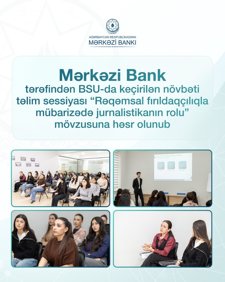 Mərkəzi Bank tərəfindən “İqtisadi jurnalistikanın inkişafına dəstək proqramı” çərçivəsində Bakı Slavyan Universitetində (BSU) keçirilən növbəti təlim sessiyası “Rəqəmsal fırıldaqçılıqla mübarizədə jurnalistikanın rolu” mövzusuna həsr olunub.