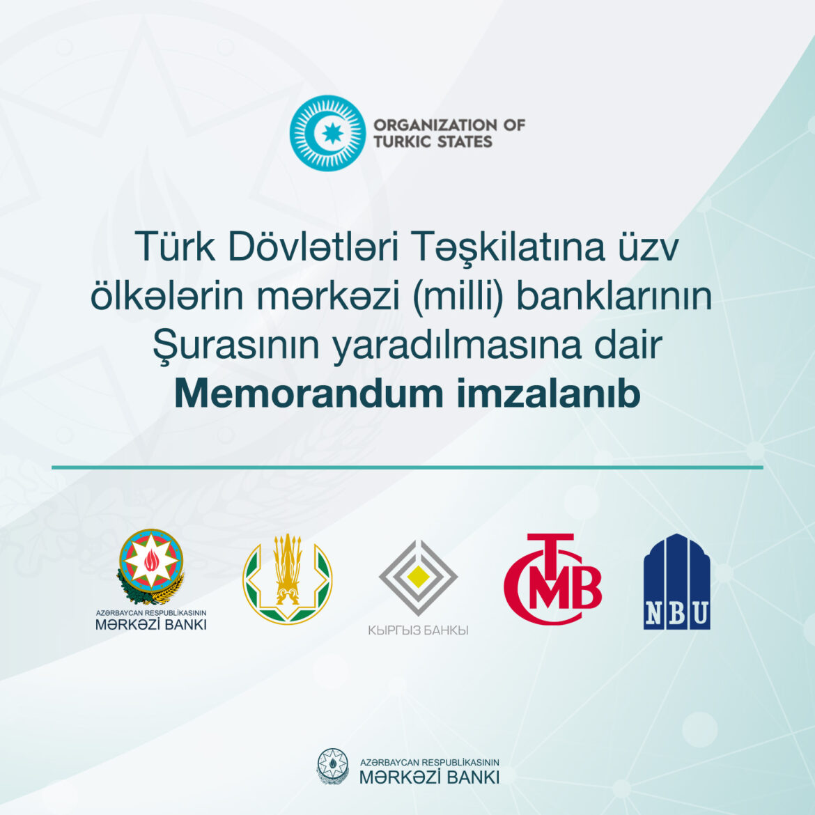 Azərbaycan Respublikasının Mərkəzi Bankının sədri Taleh Kazımovun iştirakı ilə Qırğız Respublikasının Bişkek şəhərində Türk Dövlətləri Təşkilatının On Birinci Zirvə Görüşü çərçivəsində “Türk Dövlətləri Təşkilatına üzv ölkələrin mərkəzi (milli) banklarının Şurası”nın yaradılmasına dair Memorandumun imzalanma mərasimi keçirilib. Azərbaycan, Qazaxıstan, Qırğız Respublikası, Türkiyə və Özbəkistan mərkəzi banklarının sədrləri tərəfindən imzalanan memorandum banklar arasında əməkdaşlıq əlaqələrinin möhkəmləndirilməsinə töhfə verəcək.
