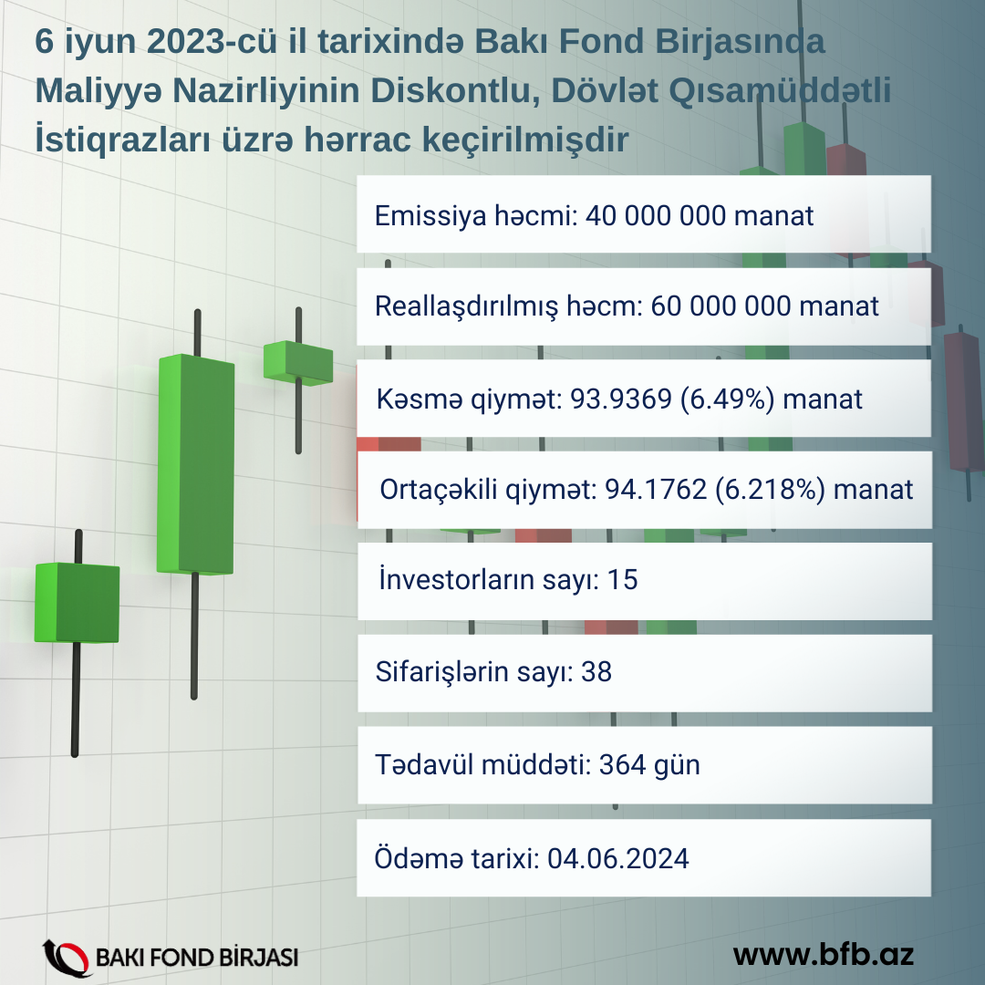 6 iyun 2023-cü il tarixində Bakı Fond Birjasında Azərbaycan Respublikasının Maliyyə Nazirliyinin AZ0101030051 ISIN-li, 40 milyon manat həcmində, 364 gün tədavül müddətli diskontlu, dövlət qısamüddətli istiqrazlarının (DQİ) yerləşdirilməsi üzrə hərrac keçirilmişdir.