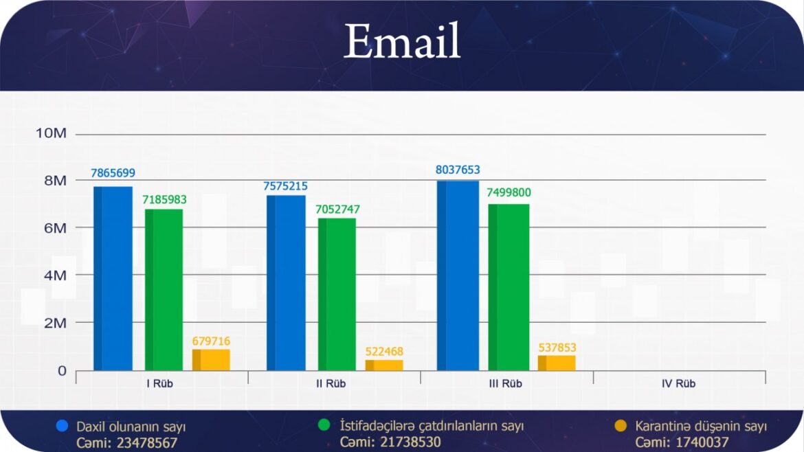 Cari ilin 9 ayı ərzində Xüsusi Rabitə və İnformasiya Təhlükəsizliyi Dövlət Xidməti tərəfindən dövlət qurumları üçün yaradılmış dövlət elektron poçt xidmətində 23,478,567 elektron poçt emal edilmişdir ki, onlardan 21,738,530-u istifadəçilərə çatdırılmış, 1,740,037-i zərərli tərkibli olması müəyyənləşdirilməklə blok edilmişdir.