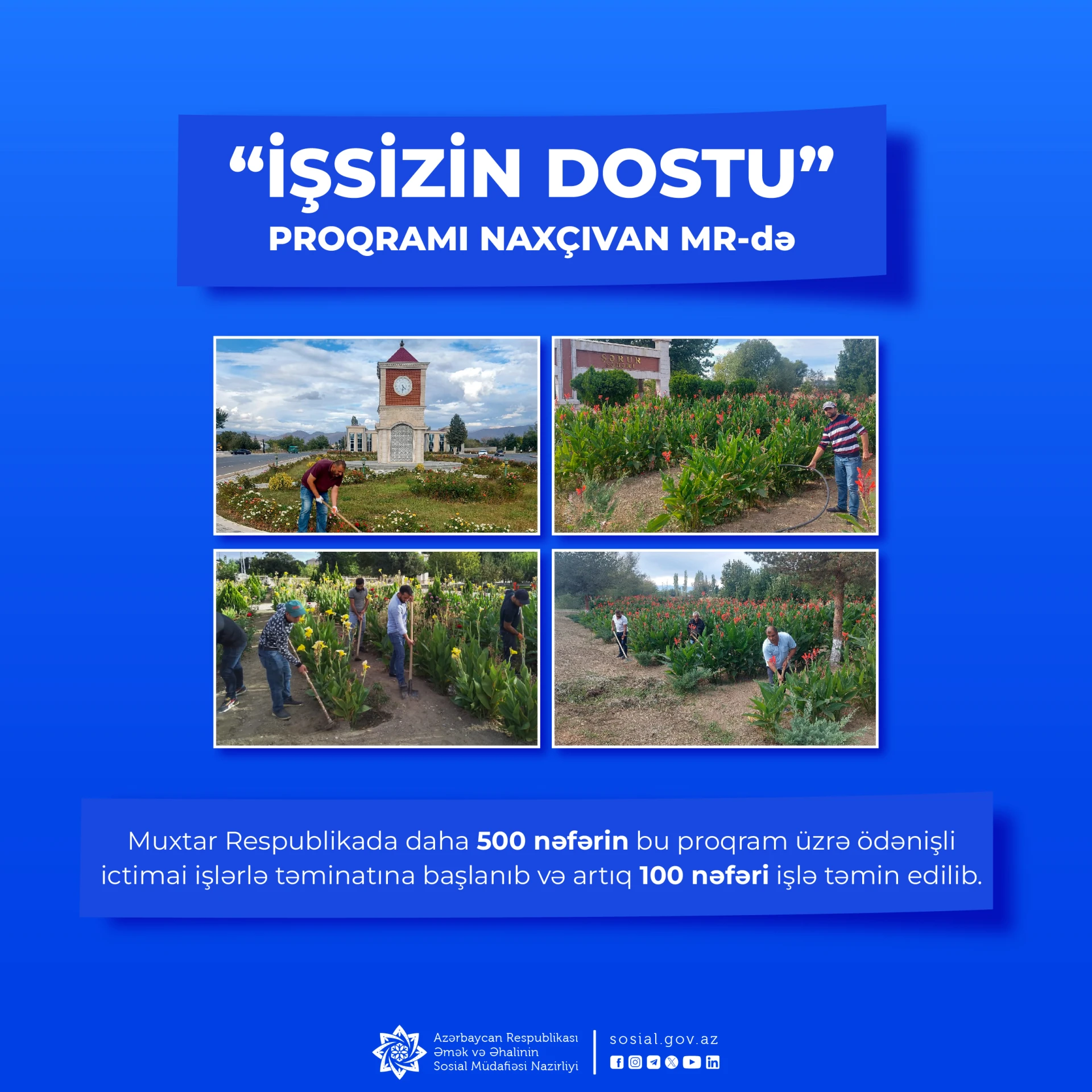 Əmək və Əhalinin Sosial Müdafiəsi Nazirliyinin tabeliyindəki DOST İş Mərkəzi tərəfindən Naxçıvan Muxtar Respublikasında daha 500 nəfərin “İşsizin dostu” proqramına cəlb edilməsinə başlanıb.