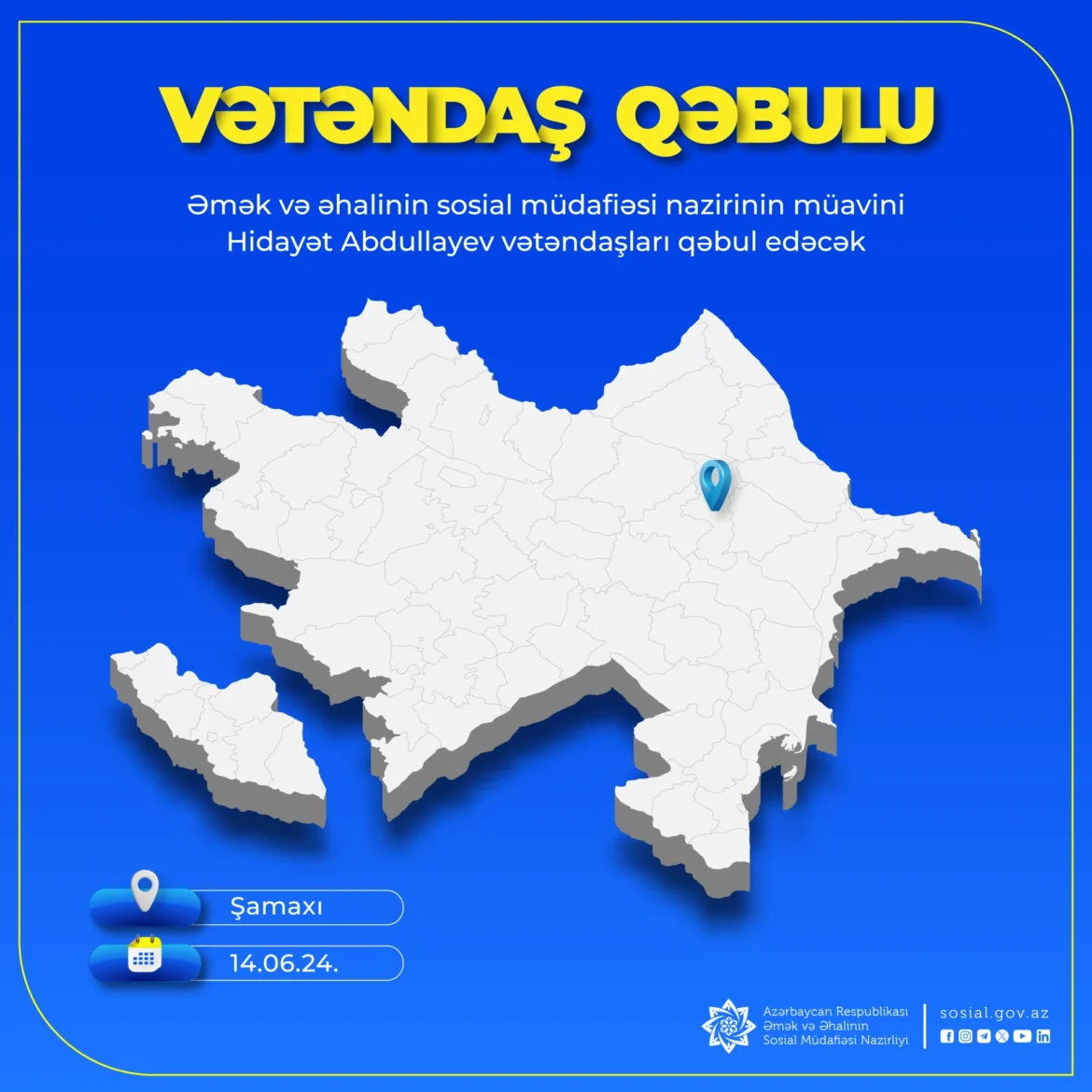 Əmək və əhalinin sosial müdafiəsi nazirinin müavini Hidayət Abdullayev iyunun 14-də Şamaxı rayonunda Şamaxı və Qobustan rayonlarının sakinlərini qəbul edəcək.