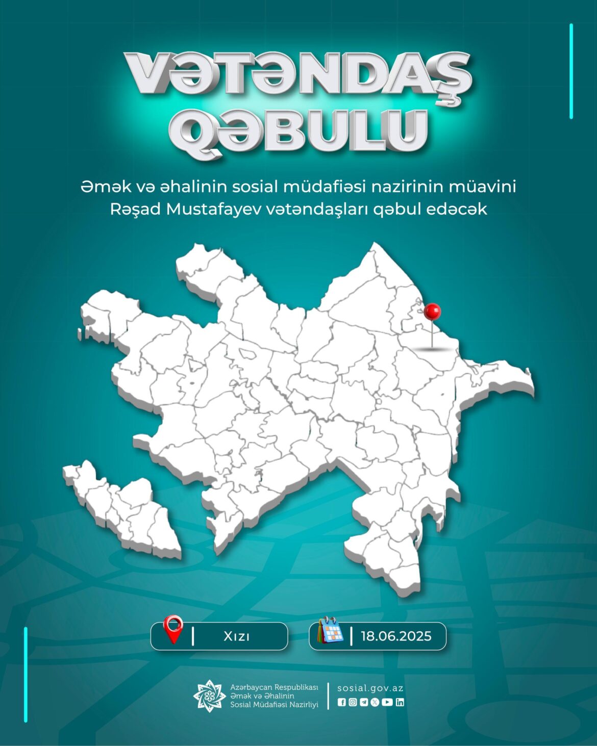 Əmək və əhalinin sosial müdafiəsi nazirinin müavini Rəşad Mustafayev iyunun 18-də Xızı rayonunda Xızı və Abşeron rayonlarının sakinlərini qəbul edəcək.
