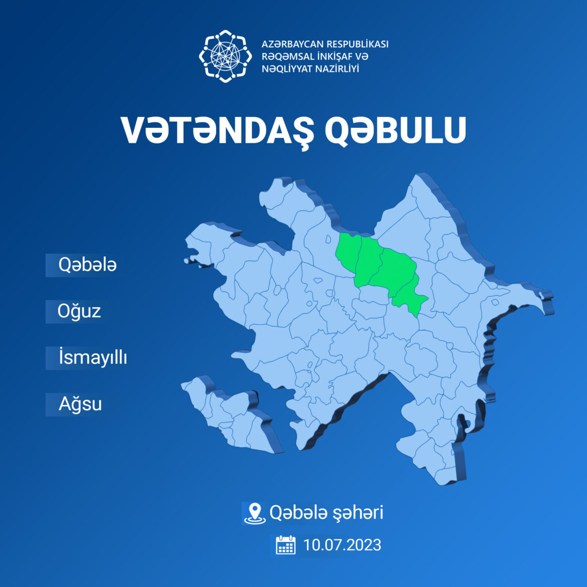Rəqəmsal inkişaf və nəqliyyat naziri Rəşad Nəbiyev 10 iyul 2023-cü il tarixində saat 10:00-da Qəbələ şəhərində yerləşən Mədəniyyət Mərkəzində Qəbələ, Oğuz, İsmayıllı və Ağsu rayonlarının sakinlərini qəbul edəcək.