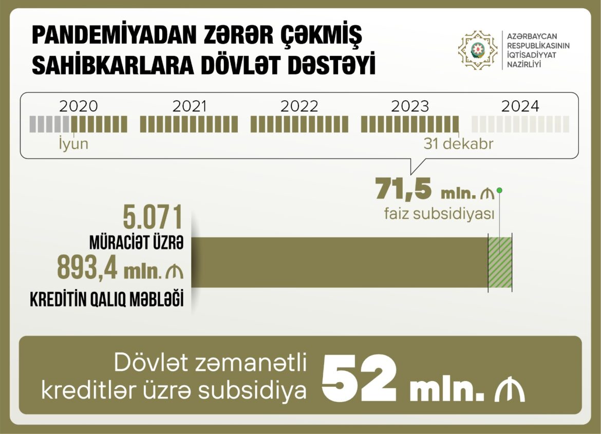 “Koronavirus (COVID-19) pandemiyasından zərər çəkmiş biznes subyektlərinə mövcud kreditlər üzrə faiz subsidiyalarının ödənilməsi məqsədilə borcu olan sahibkarların müraciəti əsasında subsidiyaların verilməsi ötən il davam etdirilib. 31 dekabr 2023-cü il tarixinə kreditin qalıq məbləği 893,4 milyon manat olan 5 071 müraciət üzrə 71,5 milyon manat faiz subsidiyası ödənilib. Dəstək proqramı çərçivəsində 31 dekabr 2023-cü il tarixinədək pandemiyadan zərər çəkmiş sahibkarlara ayrılmış dövlət zəmanətli kreditlər üzrə subsidiyanın ödənilməsi istiqamətində 52 milyon manat vəsait verilib”, – deyə o qeyd edib.