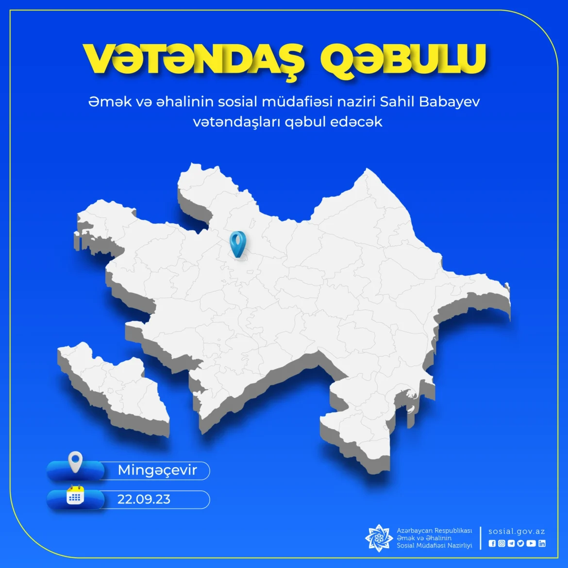 Əmək və əhalinin sosial müdafiəsi naziri Sahil Babayev sentyabrın 22-də Mingəçevir şəhərində həmin şəhərin və Yevlax rayonunun sakinlərini qəbul edəcək.