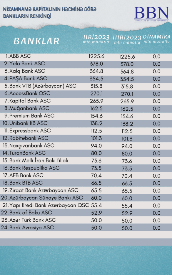 Banklar və Biznes nəşri BBN.az maliyyə göstəricilərini Azərbaycan Banklar Assosiasiyasına (ABA) təqdim etmiş bankların nizamnamə kapitalının həcminə görə renkinqini təqdim edir.