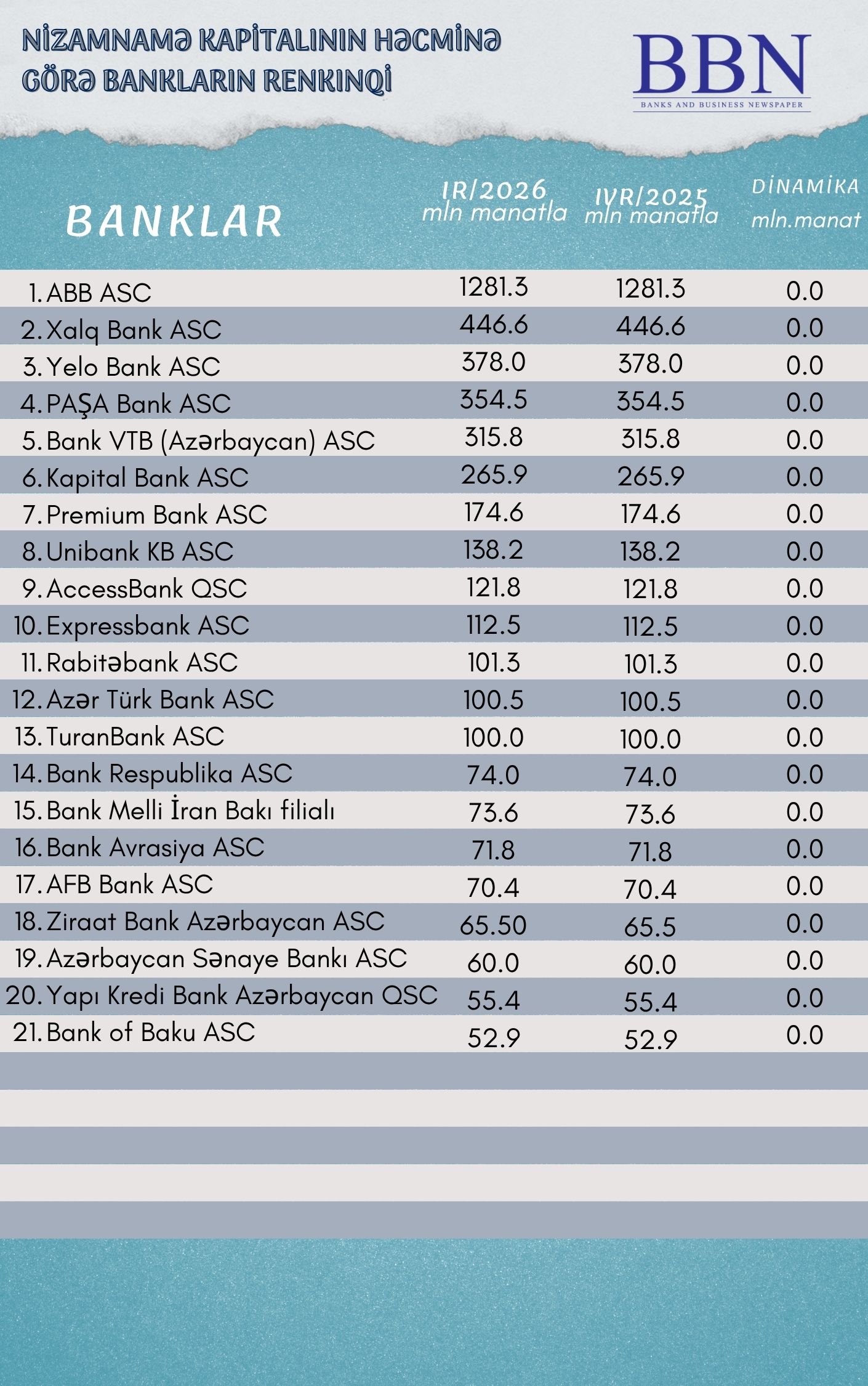 Banklar və Biznes nəşri BBN.az maliyyə göstəricilərini Azərbaycan Banklar Assosiasiyasına (ABA) təqdim etmiş bankların nizamnamə kapitalının həcminə görə renkinqini təqdim edir.