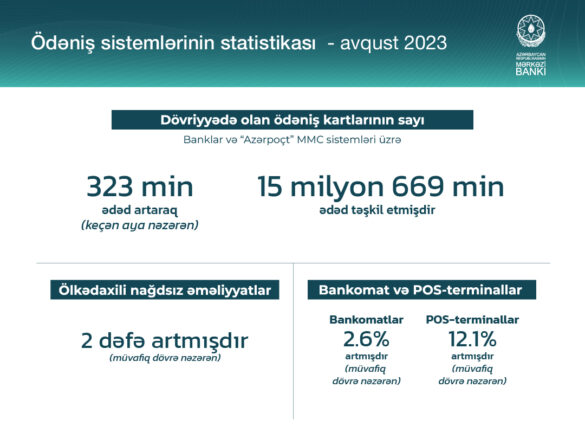 Azərbaycan Mərkəzi Bankı (AMB) ödəniş sistemlərinin statistikası – avqust 2023-ü açıqlayıb. Məlumata əsasən sentyabrın 1-nə banklar və “Azərpoçt” MMC sistemləri üzrə dövriyyədə olan ödəniş kartlarının sayı ötən aya nəzərən 323 min ədəd artaraq 15 milyon 669 min ədəd təşkil edib. Müvafiq dövrə nəzərən isə ölkədaxili nağdsız əməliyyatlar 2 dəfə artıb.