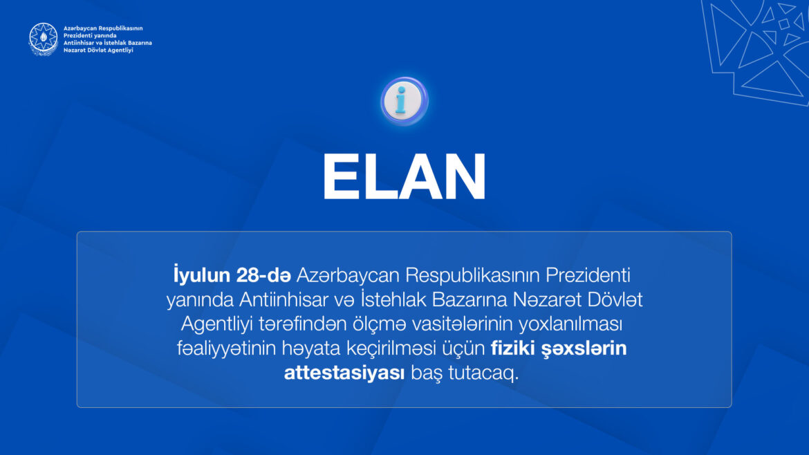 Attestasiya olunmaq məqsədilə ölçmə vasitələrinin yoxlanılması fəaliyyətini həyata keçirən fiziki şəxslər, eləcə də bu sahədə akkreditasiya olunan qurumların yoxlayıcı qismində fəaliyyət göstərən əməkdaşları 25 iyul 2025-ci il tarixinədək müvafiq ərizə formasını (“Ölçmə vasitələrinin yoxlanılmasını həyata keçirən fiziki şəxslərin attestasiyası Qaydaları”na 1 nömrəli əlavə) doldurmaqla Antiinhisar və İstehlak Bazarına Nəzarət Dövlət Agentliyinə müraciət etməlidirlər.