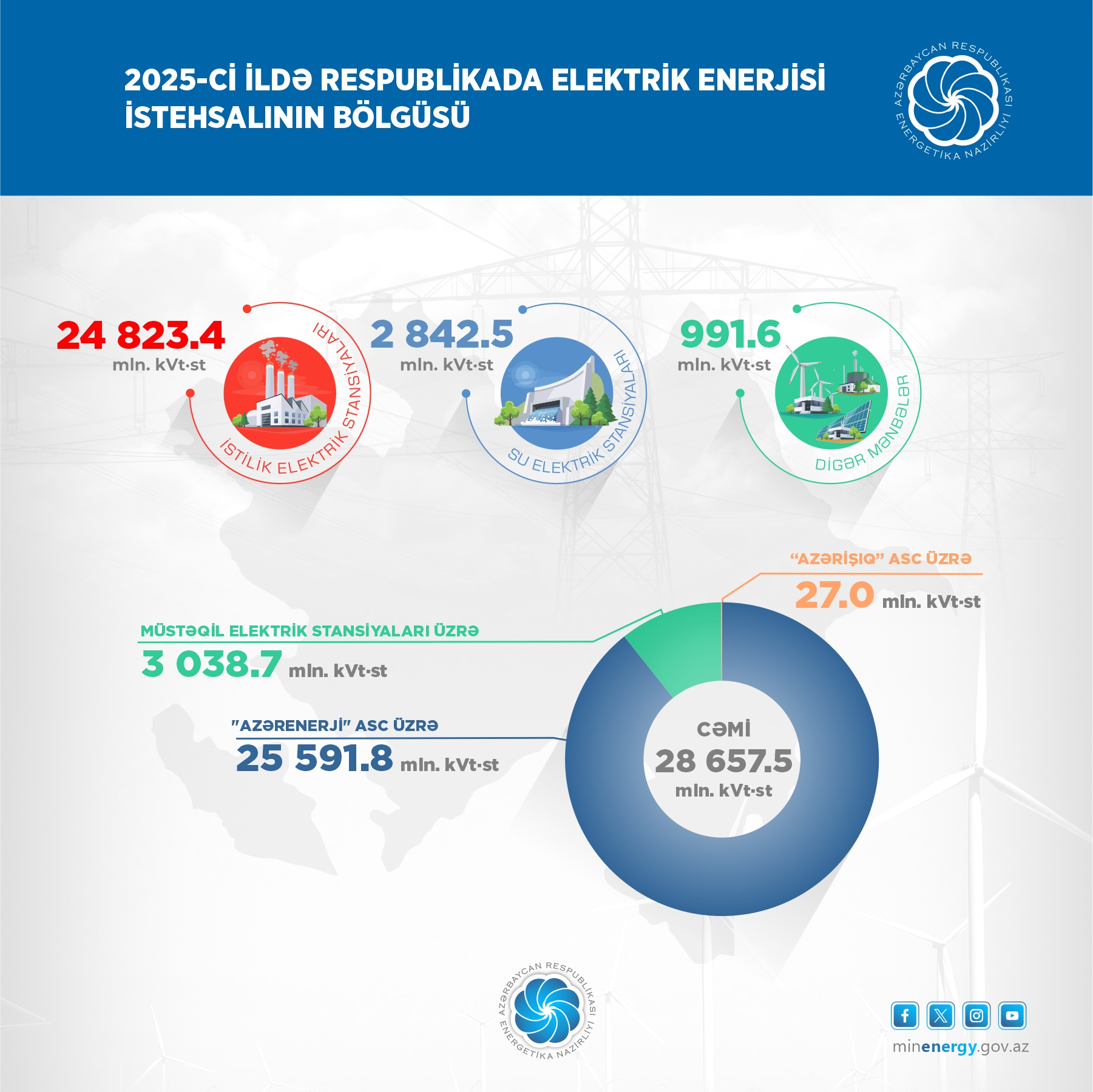 2025-ci ildə elektrik enerjisinin istehsalı “Azərenerji” ASC üzrə 25 591,8 mln. kVt·st (İES-lərdə 22 703,6 mln. kVt·st, SES-lərdə 2 827,1 mln. kVt·st, GES-lərdə 61,1 mln. kVt·st), “Azərişıq” ASC üzrə külək elektrik stansiyalarında 27,0 mln. kVt·st, müstəqil elektrik stansiyaları üzrə isə 3 038,7 mln. kVt·st təşkil edib.