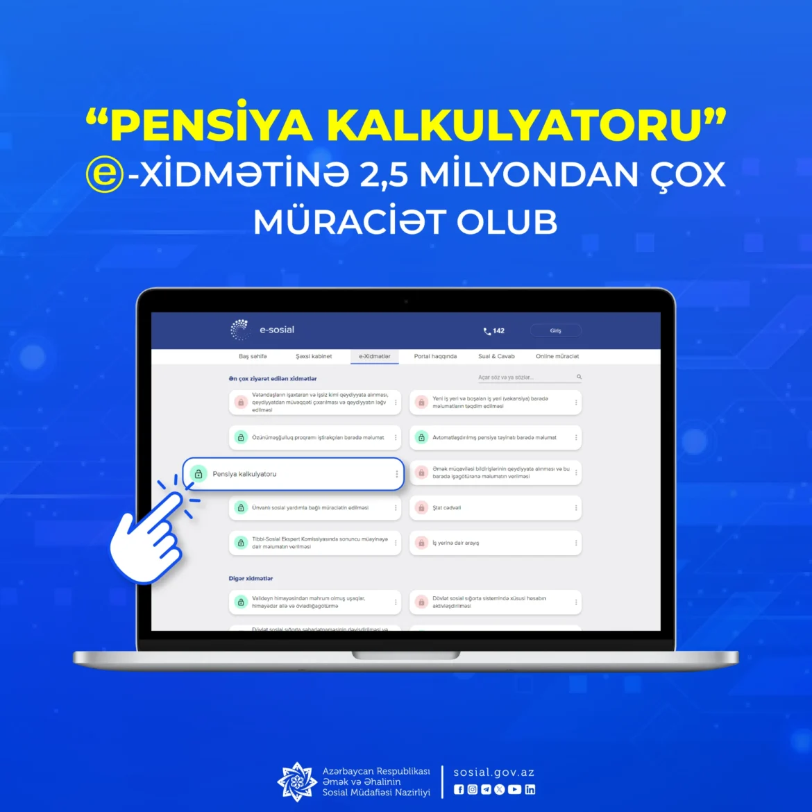 Əmək və Əhalinin Sosial Müdafiəsi Nazirliyinin e-xidmətlərindən biri olan, 2020-ci ildə istifadəyə verilmiş “Pensiya kalkulyatoru”na ötən dövrdə 2,5 milyondan çox müraciət olub.