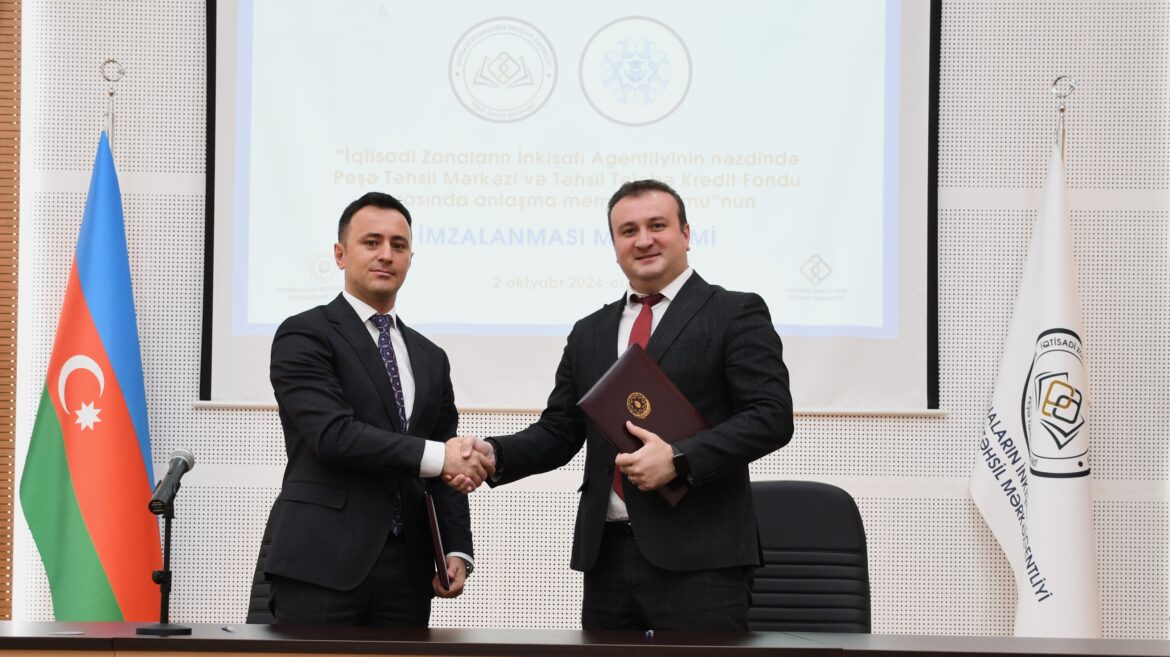 Oktyabrın 2-də İqtisadi Zonaların İnkişafı Agentliyinin Peşə Təhsil Mərkəzi ilə Elm və Təhsil Nazirliyinin tabeliyində fəaliyyət göstərən Təhsil Tələbə Krediti Fondu arasında əməkdaşlığa dair Anlaşma Memorandumu imzalanıb. Sənədi Peşə Təhsil Mərkəzinin direktoru Kənan Bağırov və Təhsil Tələbə Krediti Fondunun İdarə heyətinin sədri vəzifəsini müvəqqəti idarə edən Bəhruz Əzimov imzalayıblar.