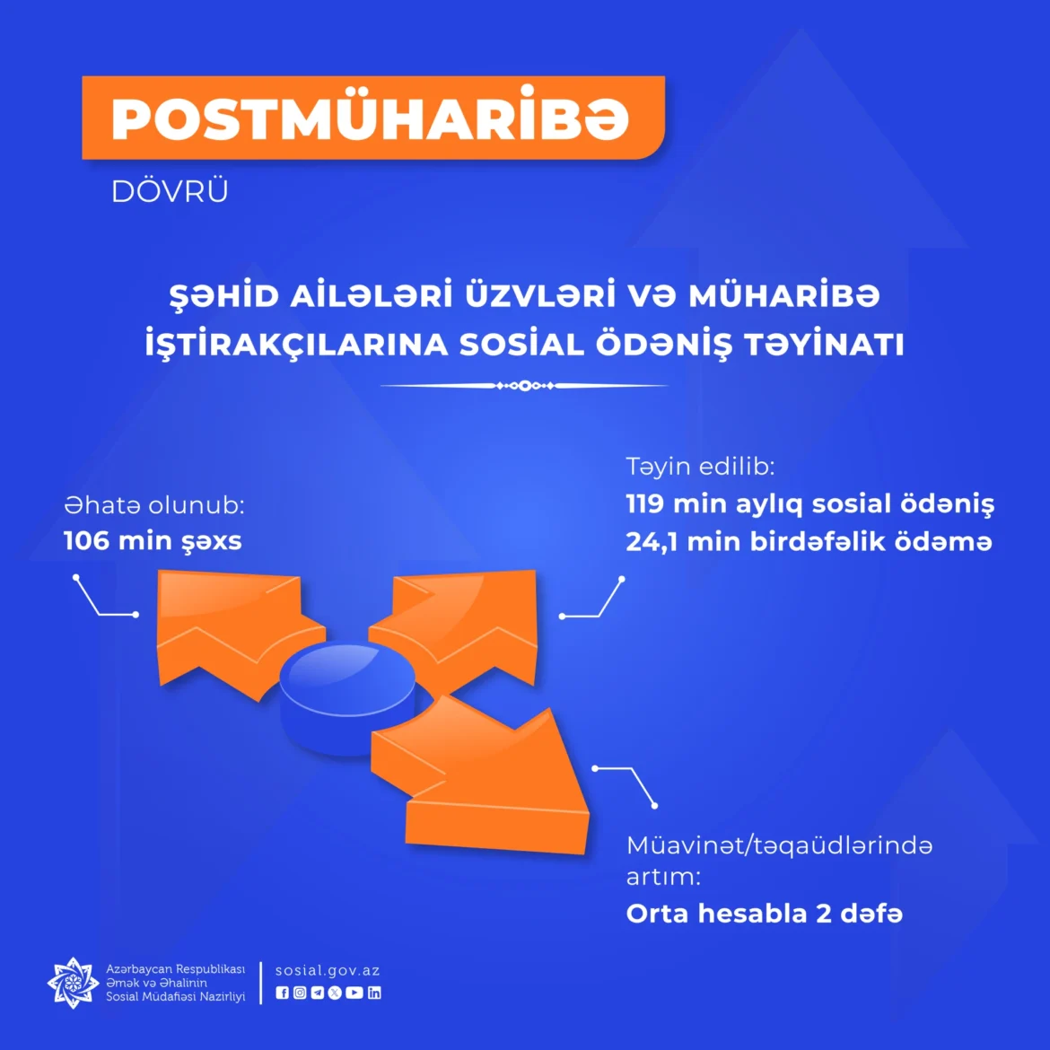 Əmək və Əhalinin Sosial Müdafiəsi Nazirliyi tərəfindən qeyd olunan dövrdə şəhid ailələri üzvləri və müharibə veteranları olan 106 min şəxsə 119 min aylıq sosial ödəniş, 24,1 min şəxsə birdəfəlik ödəmə təyin olunub.