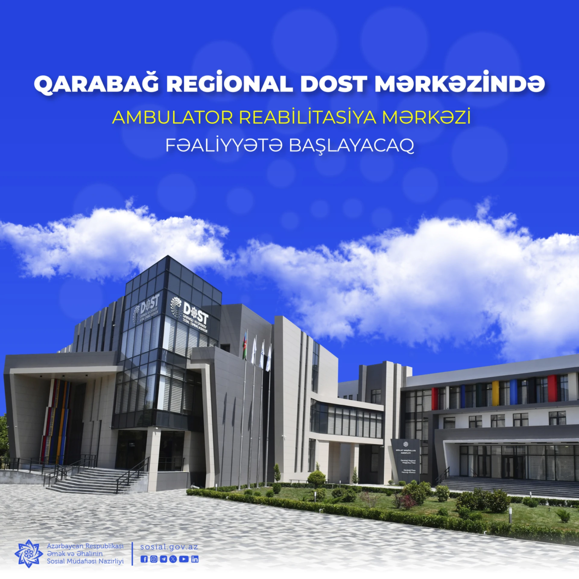 Əmək və Əhalinin Sosial Müdafiəsi Nazirliyinin tabeliyindəki Dövlət Tibbi-Sosial Ekspertiza və Reabilitasiya Agentliyi tərəfindən Bərdə şəhərindəki Qarabağ Regional DOST Mərkəzində dekabrın 1-dən Ambulator Reabilitasiya Mərkəzi – “RehaPoint” fəaliyyətə başlayacaq.