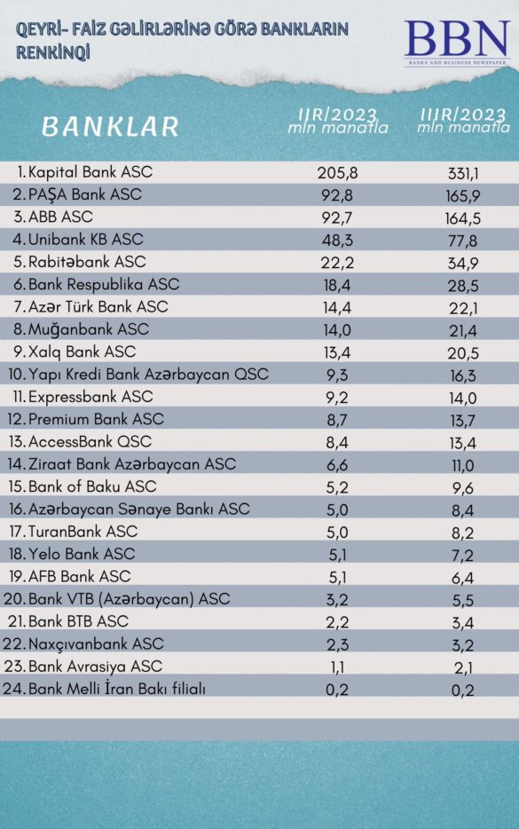 Banklar və Biznes nəşri BBN.az maliyyə göstəricilərini Azərbaycan Banklar Assosiasiyasına (ABA) təqdim etmiş bankların qeyri-faiz gəlirlərinə görə renkinqini təqdim edir.
