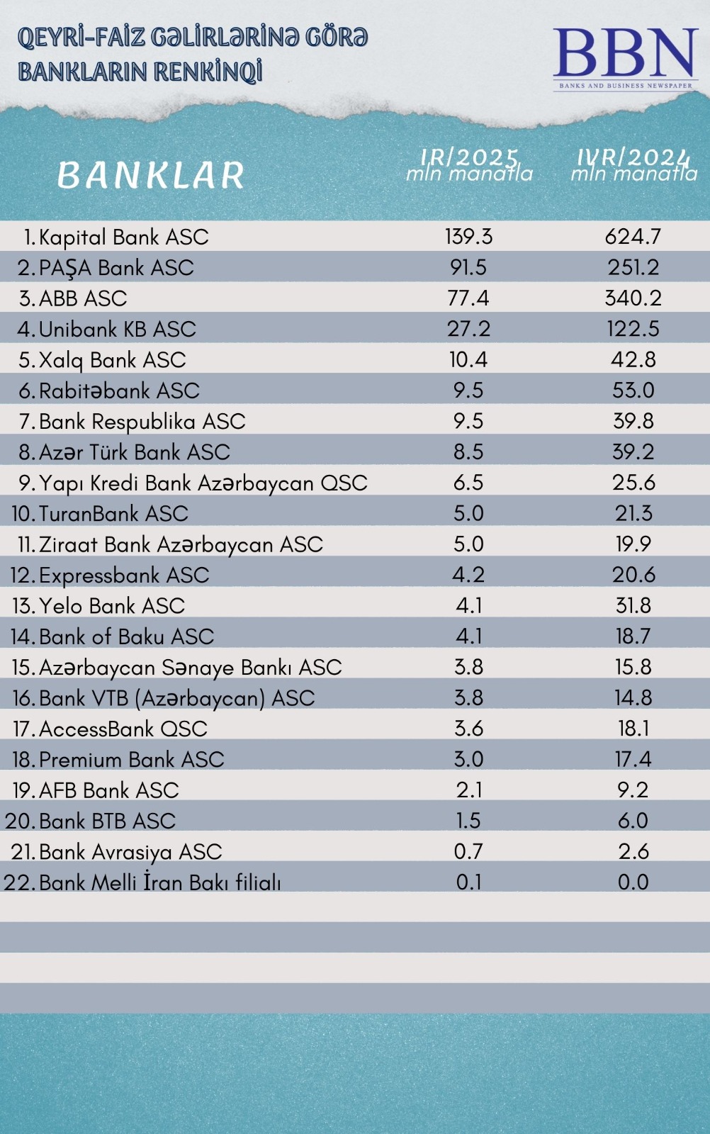 Qeyri-faiz gəlirlərinə görə hesabatlarını açıqlayan bankların renkinqi aşağıdakı kimidir: