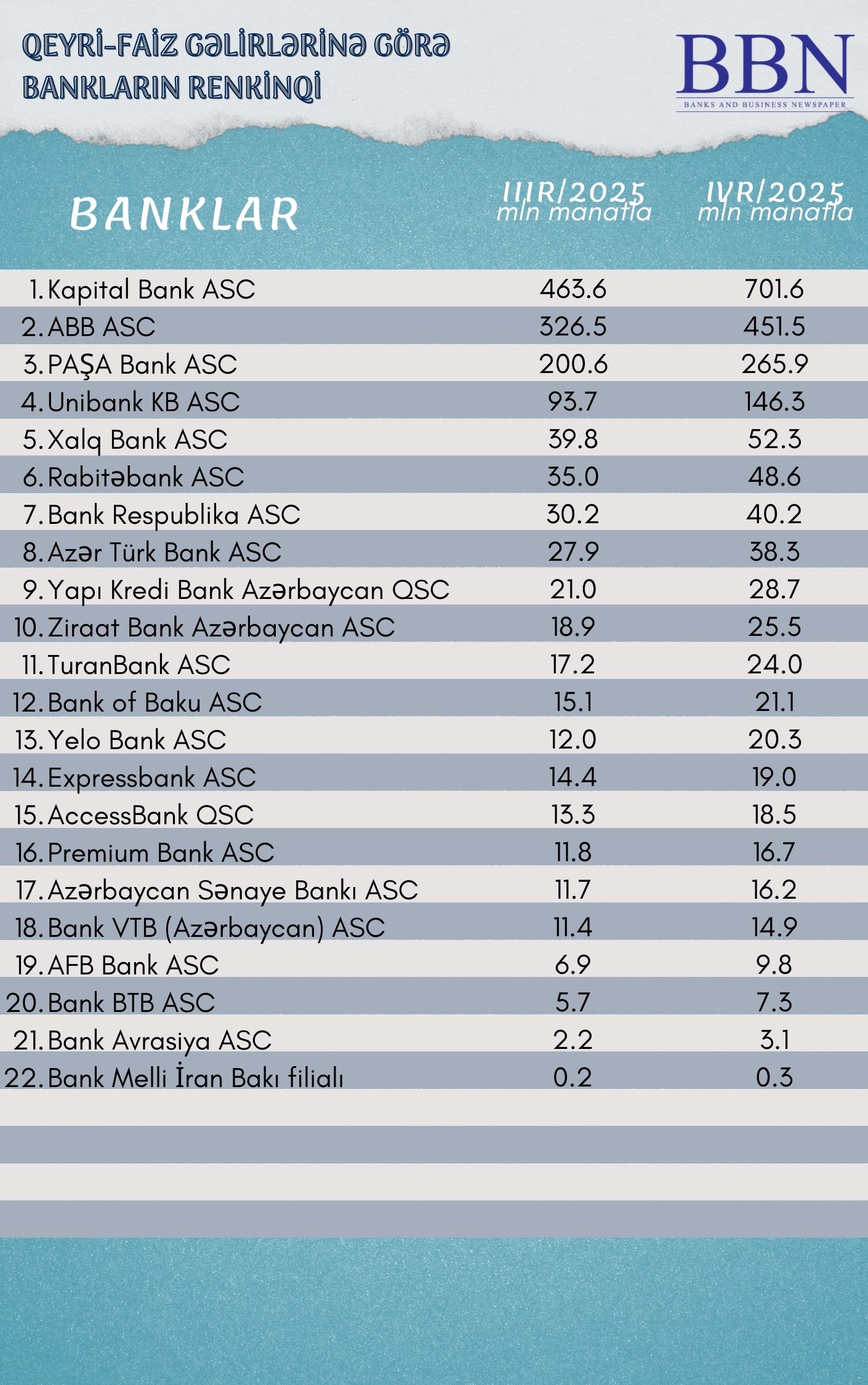 Qeyri-faiz gəlirlərinə görə hesabatlarını açıqlayan bankların renkinqi aşağıdakı kimidir: