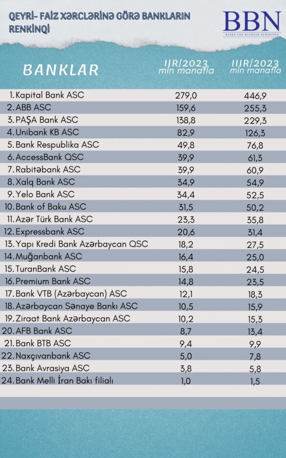 Banklar və Biznes nəşri BBN.az maliyyə göstəricilərini Azərbaycan Banklar Assosiasiyasına (ABA) təqdim etmiş bankların qeyri-faiz xərclərinə görə renkinqini təqdim edir.