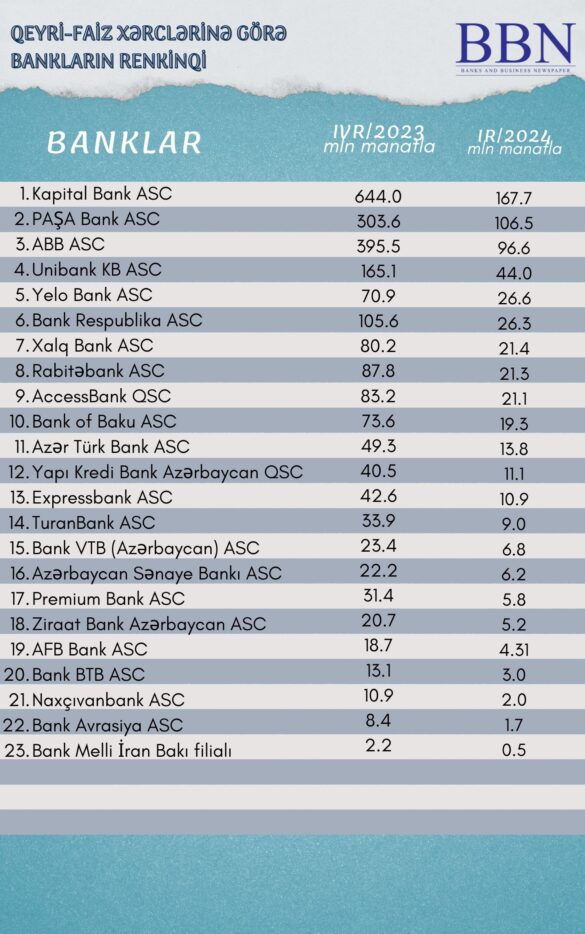 Banklar və Biznes nəşri BBN.az maliyyə göstəricilərini Azərbaycan Banklar Assosiasiyasına (ABA) təqdim etmiş bankların qeyri-faiz xərclərinə görə renkinqini təqdim edir.
