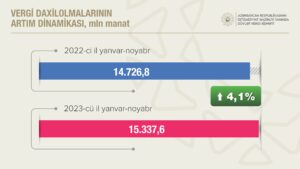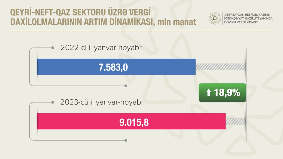 Bu ilin 11 ayında Dövlət Vergi Xidmətinin xətti ilə dövlət büdcəsinə vergi daxilolmalarının həcmi ötən ilin eyni dövrü ilə müqayisədə 4,1% artaraq 15 milyard 337,7 milyon manat olub. Bu müddətdə qeyri-neft-qaz sektorundan vergi daxilolmaları ötən ilin müvafiq dövrü ilə müqayisədə 18,9% artaraq 9 milyard 15,8 milyon manat təşkil edib.