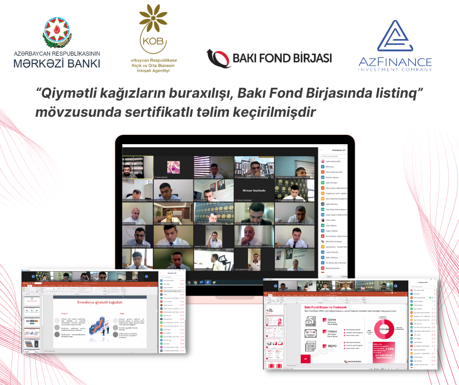 17 iyul 2023-cü il tarixində Azərbaycan Respublikasının Mərkəzi Bankı, Bakı Fond Birjası, AzFinance İnvestisiya Şirkəti və Azərbaycan Respublikasının Kiçik Orta Biznesin İnkişafı Agentliyi (KOBİA) tərəfindən yerli şirkətlər üçün “Qiymətli kağızların buraxılışı, Bakı Fond Birjasında listinq” mövzularında onlayn sertifikatlı təlim keçirilmişdir.