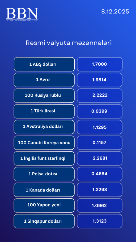 Valyuta Rəsmi valyuta məzənnələri-8.12.2025 by Zeyneb 08/12/2025 08/12/2025 0 comments 2 views 0 minutes read 2 BBN.az gündəlik valyuta məzənnələrini təqdim edir Share 0 FacebookTwitterLinkedinOdnoklassnikiWhatsappTelegramEmail previous post Dollar zəiflədikcə qızıl bahalaşır: Bazarlar Fed-in faiz endiriminə hazırlaşır next post Kriptovalyuta bazarı üçün çətin il: 2025-ci ildə 1.2 trilyon dollar dəyər silindi You may also like Rəsmi valyuta məzənnələri(13.01.2026) 13/01/2026 “InvestAZ”dan dünya maliyyə bazarları ilə bağlı həftəlik analiz 12/01/2026 Rəsmi valyuta məzənnələri(12.01.2026) 12/01/2026 Asiya bazarları geriləyir, dollar möhkəm qalır 09/01/2026 Rəsmi valyuta məzənnələri(09.01.2026) 09/01/2026 Honq-Konq birjasında indekslər geriləyib 08/01/2026 Leave a Comment Cancel Reply Your rating: Save my name, email, and website in this browser for the next time I comment. Δ
