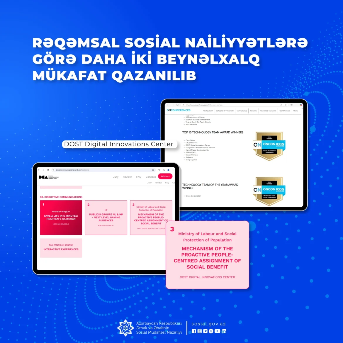 Nazirliyin tabeliyindəki DOST Rəqəmsal İnnovasiyalar Mərkəzi isə ABŞ-nin “OnCon Icon Awards 2024” müsabiqəsinin” 10 ən yaxşı texnologiya komandası” kateqoriyasında qalib seçilib.
