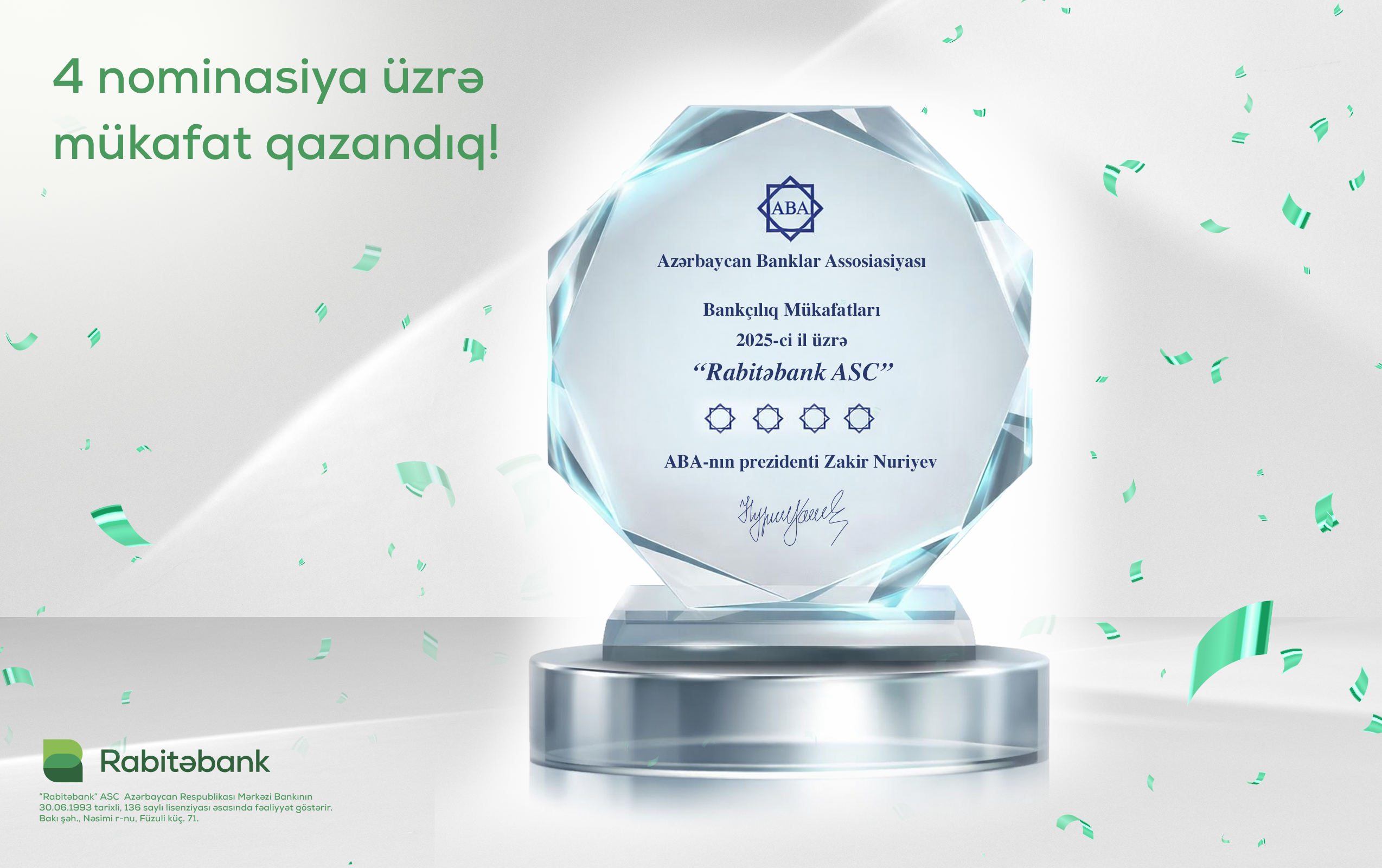 Rabitəbank Azərbaycan Banklar Assosiasiyası (ABA) tərəfindən təşkil olunan “Bankçılıq Mükafatları – 2025” tədbiri çərçivəsində 4 mühüm nominasiya üzrə mükafata layiq görülüb. Bankın il ərzində həyata keçirdiyi çoxşaxəli fəaliyyətlər, innovativ yanaşmaları və sosial məsuliyyət təşəbbüsləri nüfuzlu mükafatlarla yüksək qiymətləndirilib.