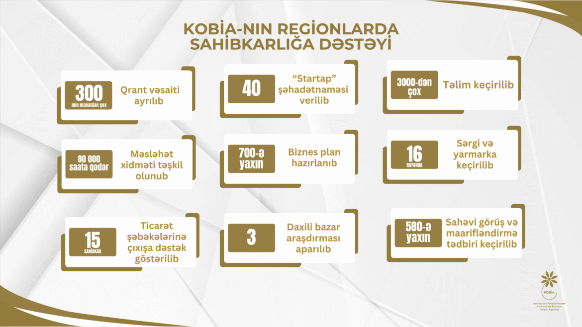 Bugünədək Agentlik tərəfindən regionlarda fəaliyyət göstərən sahibkarlar və biznesə başlamaq istəyən şəxslər üçün ödənişsiz olaraq 3 mindən çox təlim, 80 min saata qədər məsləhət xidməti təşkil olunub. KOBİA-nın dəstəyi ilə hazırlanmış biznes planların 700-ə yaxını da region sahibkarlarının və ya bölgələrdə icra olunacaq layihələrin payına düşür.