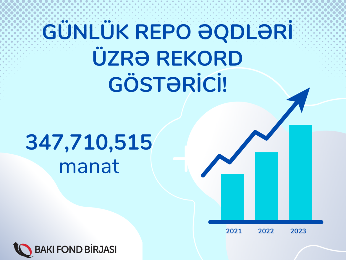 Bakı Fond Birjasında 13.10.2023-cü il tarixində Repo qısamüddətli borclanma alətinin ticarəti üzrə rekord həcm reallaşmışdır. Belə ki, 13 oktyabr tarixində repo əqdləri üzrə ticarət həcmi 348 milyon manat olmuşdur.