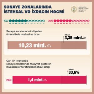 Sənaye zonalarında bugünədək ümumilikdə 10,23 milyard manatlıq məhsul istehsal edilib ki, bunun 3,35 milyard manatlıq hissəsi ixrac olunub. “Made In Azerbaijan” brendi adı ilə dünyanın 60-a yaxın ölkəsinə ixrac həyata keçirilir. Cari ilin I yarısında sənaye zonalarında fəaliyyət göstərən müəssisələr tərəfindən 1,4 milyard manatlıq məhsul satılıb ki, bunun 33,6%-lik hissəsi ixracın payına düşür.