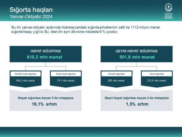 MaliyyəÖnə çıxanlarSığortaStatistika Sığorta sektorunun yanvar – oktyabr aylarına dair – STATİSTİKASI – Foto by anar 26/11/2024 26/11/2024 0 comments 3 views 0 minutes read 3 Azərbaycan Respublikasının Mərkəzi Bankı (AMB) sığorta sektorunun cari ilin yanvar-oktyabr aylarına dair statistikasını açıqlayıb. Sığorta Share 0 FacebookTwitterLinkedinOdnoklassnikiWhatsappTelegramEmail previous post “Azexport” və “MeetUp Networking Club” Latviyanın “STC” şirkəti ilə görüş keçirib next post Mərkəzi Bankda növbəti valyuta hərracı keçirilib You may also like Dünyada 3–4%, Azərbaycanda 13–14%: Bank faizlərinin ağırlığı – iqtisadçı açıqlayır 22/01/2026 Rəsmi gəliri olmayan şəxslər niyə banklardan kredit ala bilmir? – İqtisadçı açıqlayır 22/01/2026 Kapital Bank-ın istehlak kreditləri portfeli 7%-dək artıb 22/01/2026 Planlarını təxirə salma: Yelo Bank-da sərfəli qızıl krediti kampaniyası davam edir 22/01/2026 “Bank BTB”nin əməliyyat mənfəəti 11 faizdən çox artıb 22/01/2026 AccessBank 7 milyon dollarlıq kredit xətti cəlb edib 22/01/2026 Leave a Comment Cancel Reply Your rating: Save my name, email, and website in this browser for the next time I comment. Δ