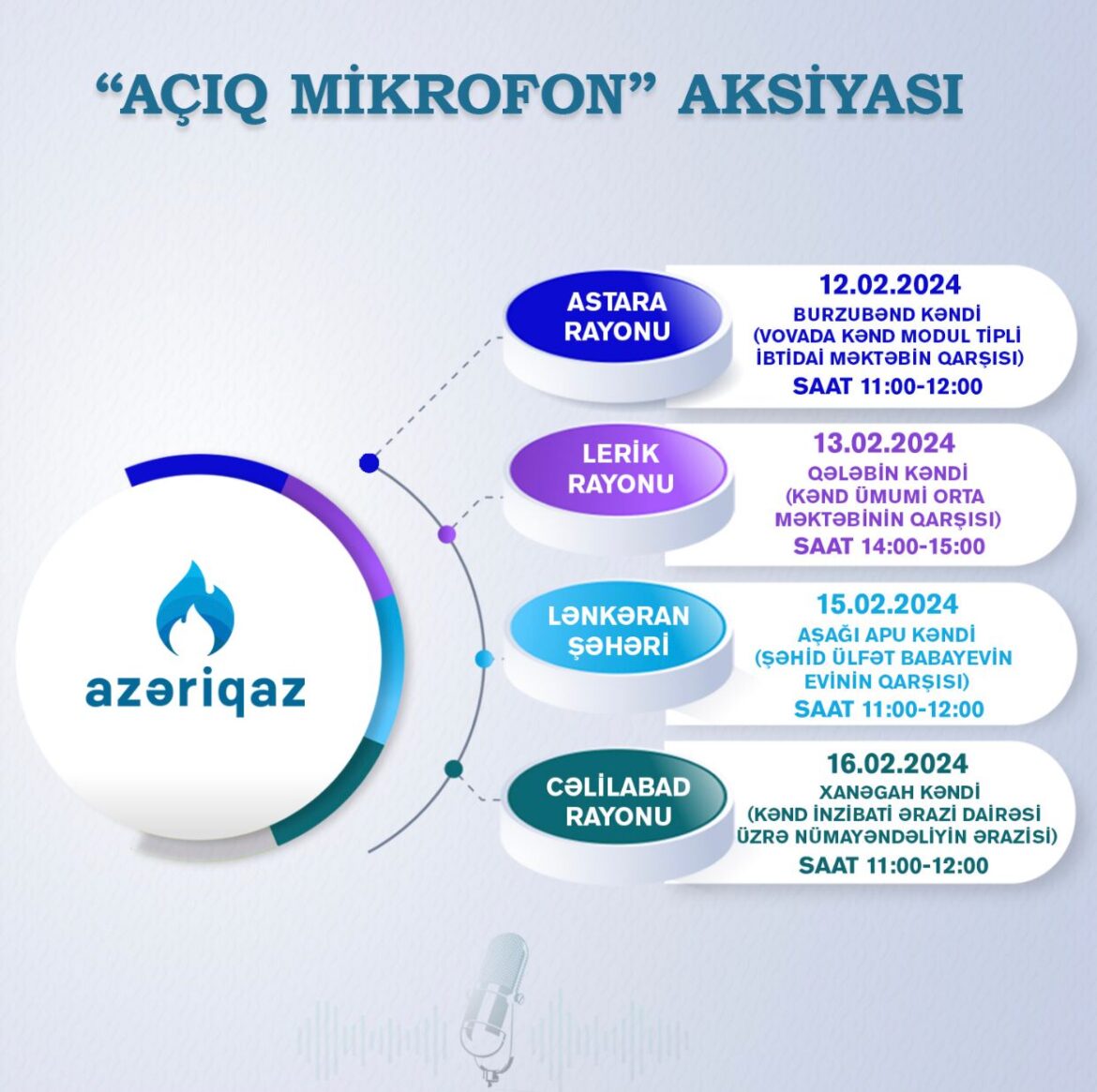 12,13, 15 və 16 fevral tarixləri 3 rayon və 1 şəhərdə “Azəriqaz” İB-nin “Açıq mikrofon” aksiyası keçiriləcək. Aksiya həftənin 1-ci günü saat 11:00-dan 12:00-dək Astara rayonunun Burzubənd kəndində (Vovada kənd modul tipli ibtidai məktəbin qarşısı), 2-ci günü saat 14:00-dan 15:00-dək Lerik rayonunun, Qələbin kəndində (Kənd ümumi orta məktəbinin qarşısı), 4-cü günü saat 11:00-dan 12:00-dək Lənkəran şəhərində (Aşağı Apu kəndi, şəhid Ülfət Babayevin evinin qarşısı), 5-ci günü saat 11:00-dan 12:00-dək isə Cəlilabad rayonunun Xanəgah kəndində (Kənd İnzibati Ərazi Dairəsi üzrə Nümayəndəliyin ərazisi) baş tutacaq. Vətəndaşlar qeyd olunan ünvanlara yaxınlaşaraq “Açıq mikrofon” aksiyasının imkanlarından maksimum istifadə edərək, öz problem və təkliflərini rahat şəkildə ifadə edə bilərlər.