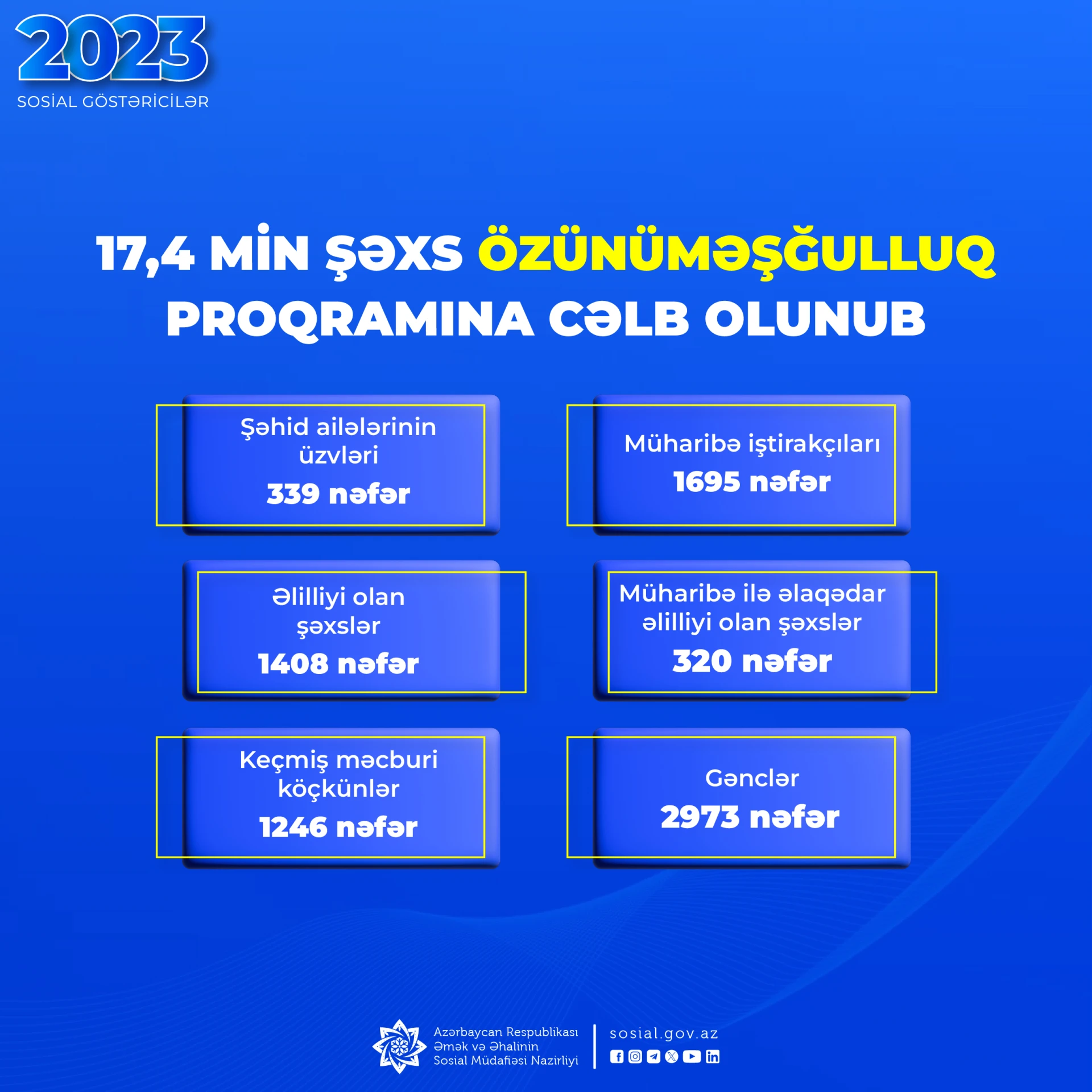 Əmək və Əhalinin Sosial Müdafiəsi Nazirliyinin tabeliyində Dövlət Məşğulluq Agentliyi tərəfindən icra olunan özünüməşğulluq proqramına ötən il 17,4 min şəxs cəlb olunaraq onlar üçün kənd təsərrüfatı, istehsal və xidmət sahələri üzrə kiçik təsərrüfatlar yaradılıb.