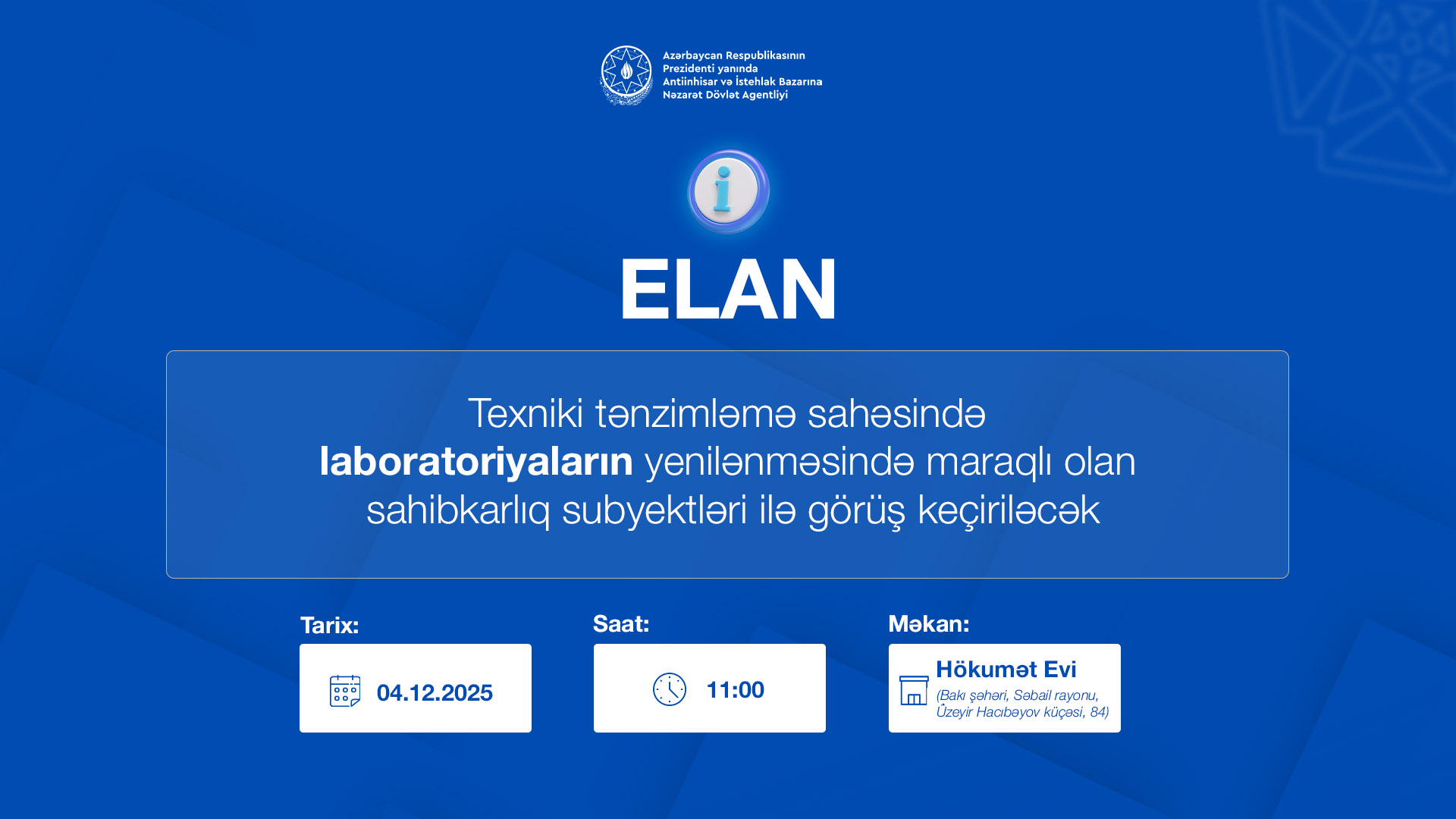 Azərbaycan Respublikasının Prezidenti yanında Antiinhisar və İstehlak Bazarına Nəzarət Dövlət Agentliyi tərəfindən 04 dekabr 2025-ci il, saat 11:00-da texniki tənzimləmənin şamil olunduğu malların tədqiqinin (sınağının) aparılmasını təmin edən laboratoriyaların fəaliyyətinin təkmilləşdirilməsində, o cümlədən yeni laboratoriyaların qurulmasında maraqlı olan sahibkarlıq subyektlərinin nümayəndələri ilə görüş təşkil olunacaq.