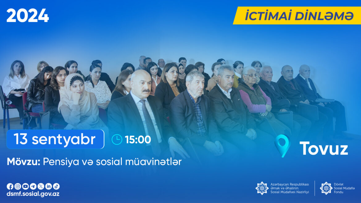 Əmək və Əhalinin Sosial Müdafiəsi Nazirliyinin tabeliyində Dövlət Sosial Müdafiə Fondu tərəfindən 13 sentyabr 2024-cü il tarixində saat 15:00-da Tovuz rayonunda Qazax və Tovuzdan olan ictimaiyyət nümayəndələrinin iştirakı ilə pensiya və sosial müavinətlərə dair ictimai dinləmə keçiriləcək.