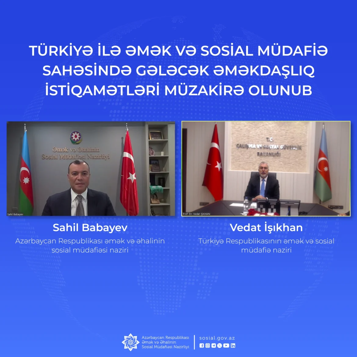 Əmək və əhalinin sosial müdafiəsi naziri Sahil Babayevlə Türkiyə Respublikasının əmək və sosial müdafiə naziri Vedat İşıkhan arasında videoformatda görüş olub.