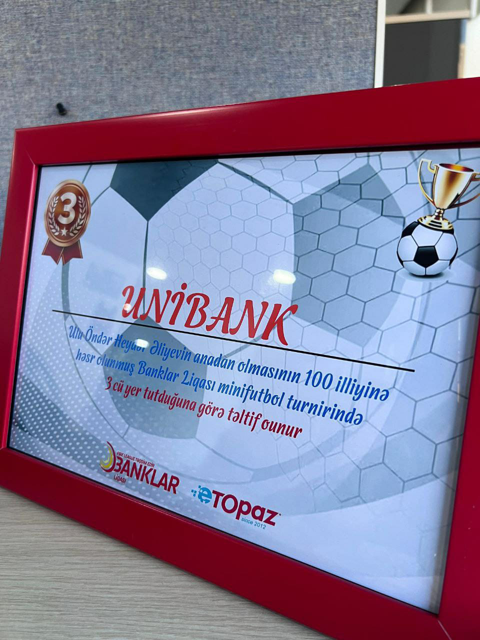 Unibank komandası Ümumilli lider Heydər Əliyevin anadan olmasının 100 illiyinə həsr olunmuş Banklar liqası minifutbol turnirində 3-cü yerin qalibi olaraq, bürünc medalla mükafatlandırılıb. 3-cü yer uğrunda oyun Unibank komandasının böyük üstünlüyü ilə keçib və komanda inamlı qələbə qazanıb. Turnir boyu Unibank komandası rəqib komandaların qapısından ümumilikdə 44 qol keçirib.