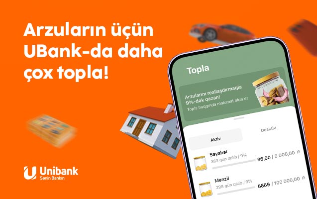 “Unibank”ın UBank mobil tətbiqində təqdim etdiyi, onlayn “Topla” məhsulu sizə hədəflərinizə çatmaq üçün pul yığmağa imkan yaradır. İstədiyiniz yerdə, istədiyiniz vaxtda onlayn daxılınıza minimal məbləğlə pul yığmağa başlaya və seçdiyiniz müddət ərzində hədəf məbləğinizi toplayaraq, əlavə faizlər qazana bilərsiniz. Onlayn depozit hesabınızdakı vəsait Əmanətlərin Sığortalanması Fondunun şərtlərinə uyğun sığortalanır.