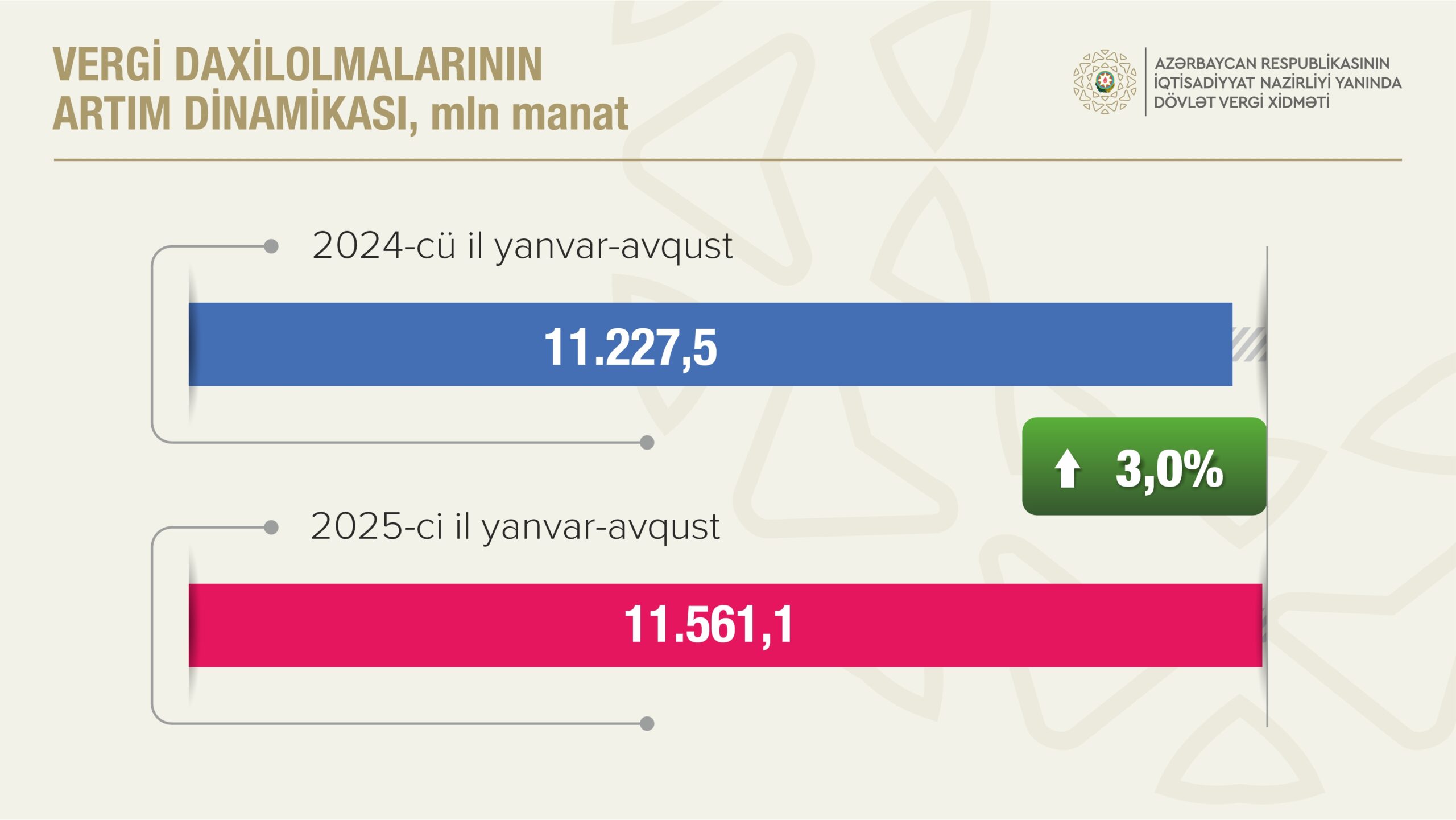 2025-ci ilin yanvar-avqust aylarında İqtisadiyyat Nazirliyi yanında Dövlət Vergi Xidmətinin xəttilə dövlət büdcəsinə 11 milyard 561,1 milyon manat vergi daxil olub, proqnoza 105,4 faiz əməl edilib. 2024-cü ilin müvafiq dövrü ilə müqayisədə dövlət büdcəsinə vergi daxilolmaları 333,6 milyon manat və ya 3,0 faiz artıb.