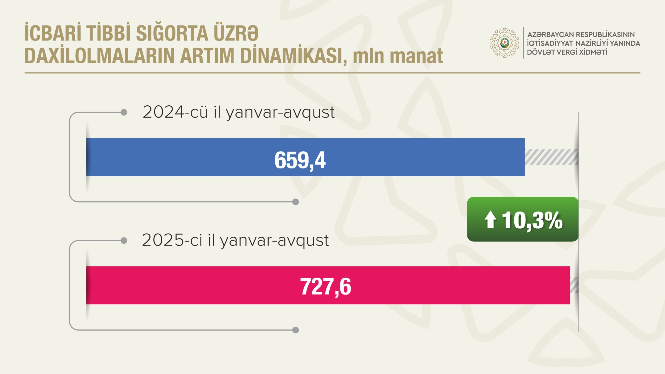 İcbari tibbi sığorta haqları üzrə daxilolmalar ötən ilin eyni dövrünə nisbətən 10,3 faiz artıb və 727,6 milyon manat olub. Qeyri-büdcə təşkilatları üzrə daxilolmalar 10,0 faiz artaraq 515,0 milyon manat təşkil edib.