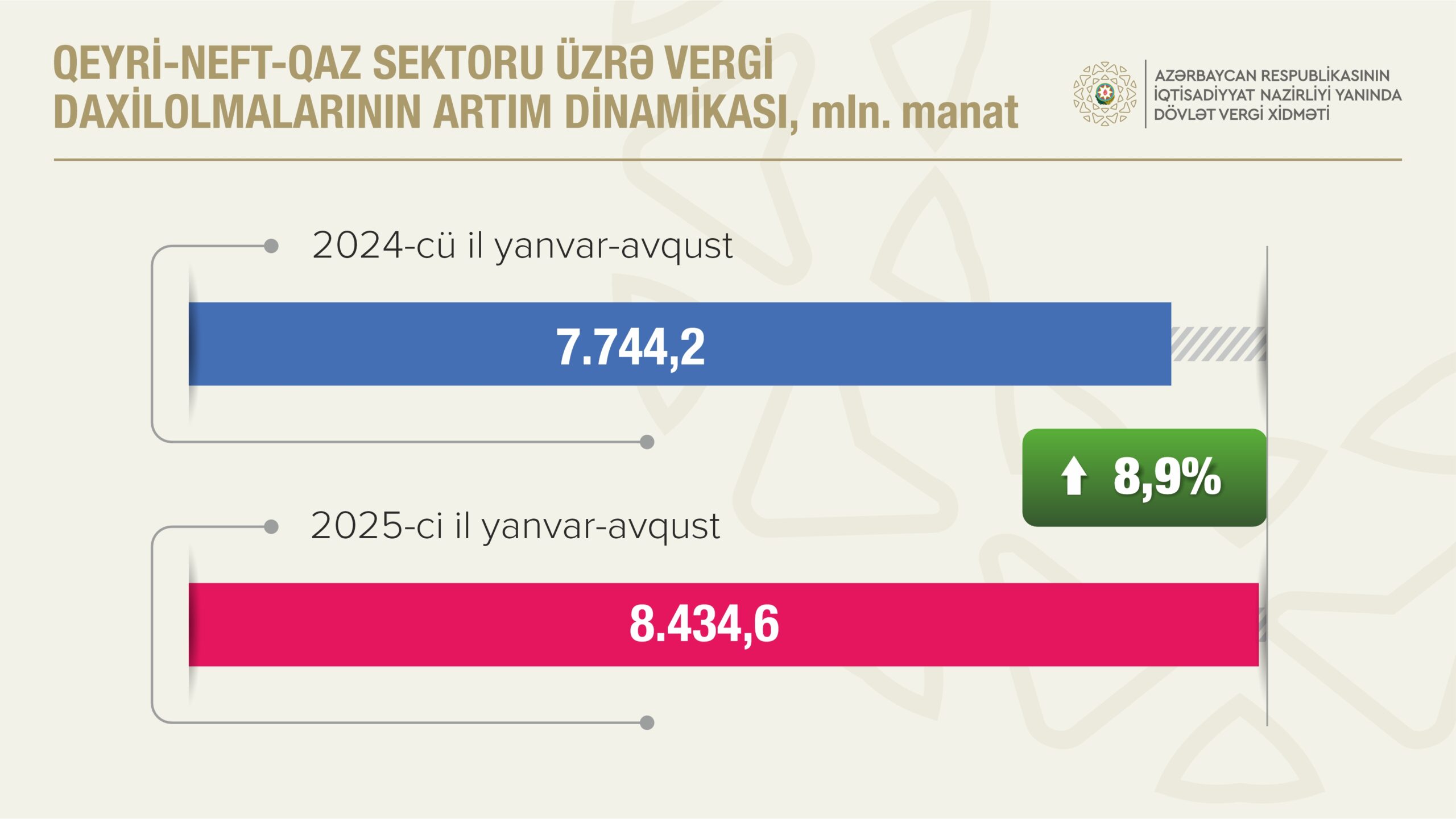 Qeyri-neft-qaz sektorunda daxilolmalar 8 milyard 434,6 milyon manat olub, proqnoz 103,0 faiz icra olunub. Əvvəlki ilin müvafiq dövrü ilə müqayisədə bu sektordan vergi daxilolmaları 690,4 milyon manat və ya 8,9 faiz çox olub. Ödənilən vergilərin 73,0 faizi qeyri-neft-qaz sektorunun, 27,0 faizi isə neft-qaz sektorunun payına düşüb.