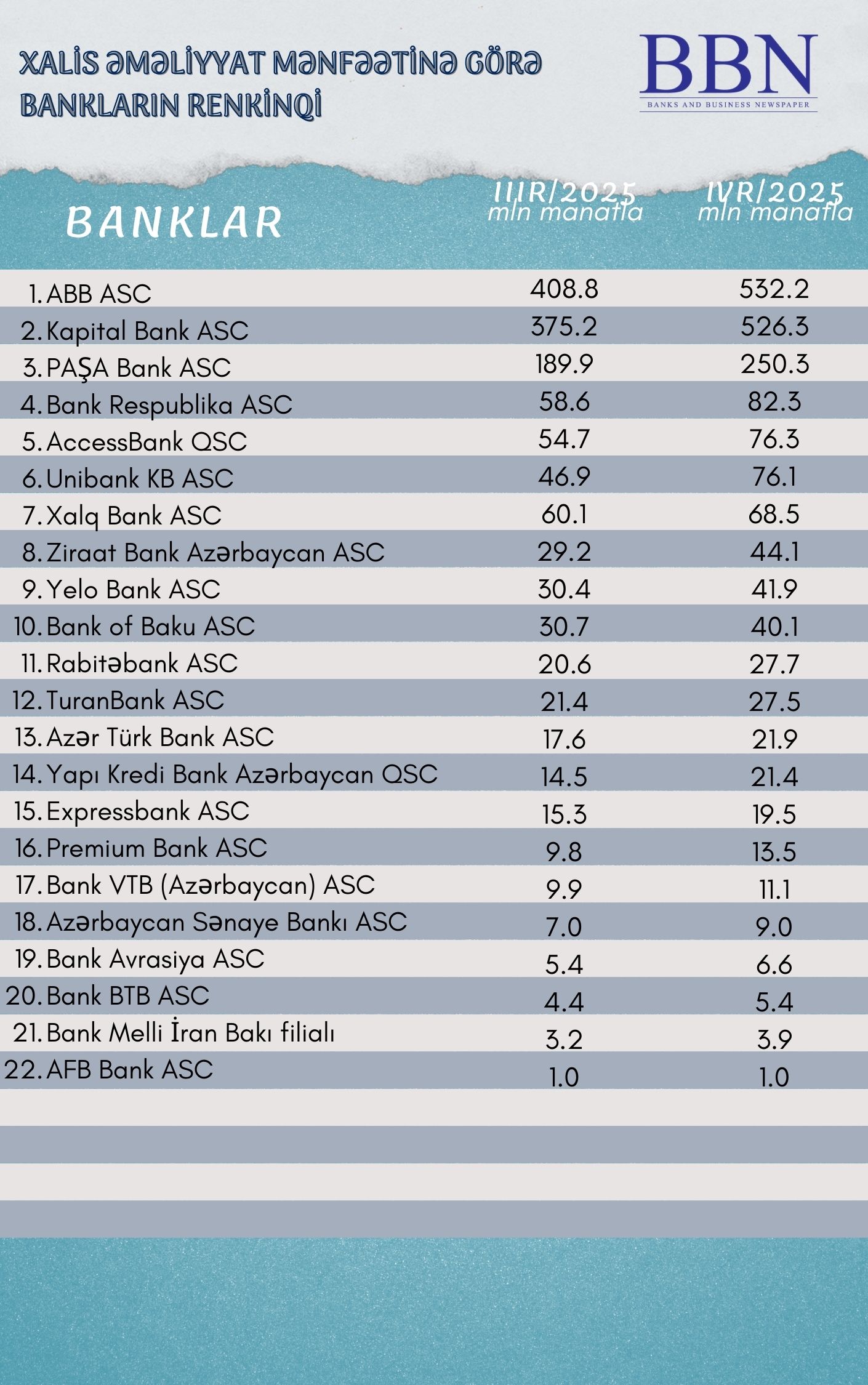 Banklar və Biznes nəşri BBN.az maliyyə göstəricilərini Azərbaycan Banklar Assosiasiyasına (ABA) təqdim etmiş bankların xalis əməliyyat mənfəətinə görə renkinqini təqdim edir.
