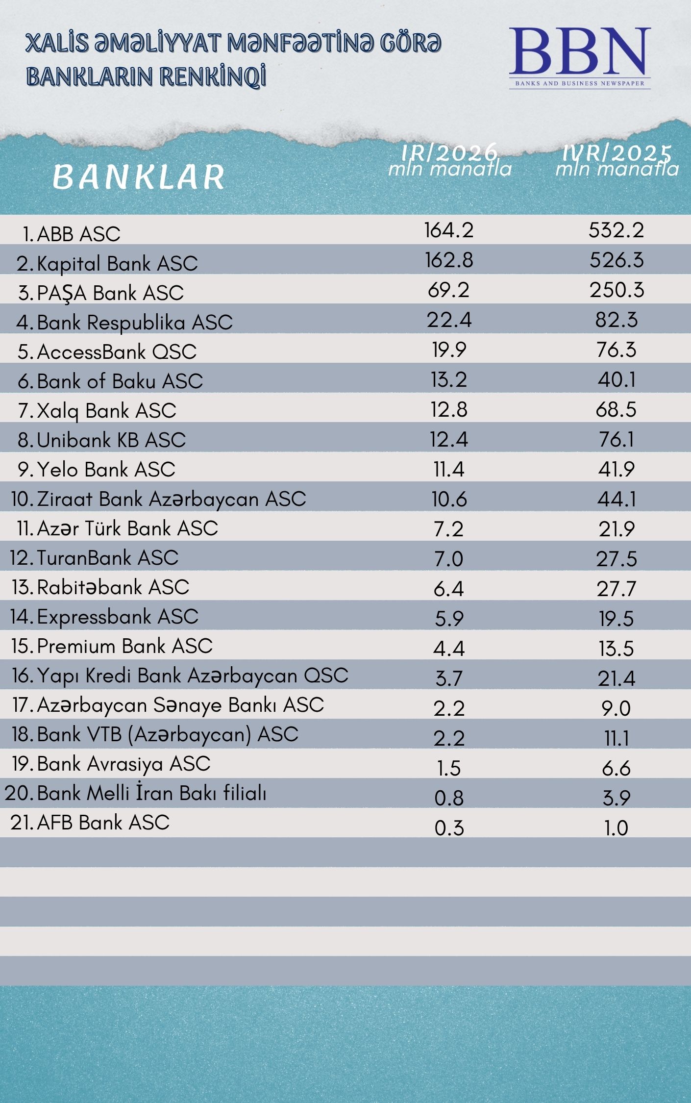 Banklar və Biznes nəşri BBN.az maliyyə göstəricilərini Azərbaycan Banklar Assosiasiyasına (ABA) təqdim etmiş bankların xalis əməliyyat mənfəətinə görə renkinqini təqdim edir.